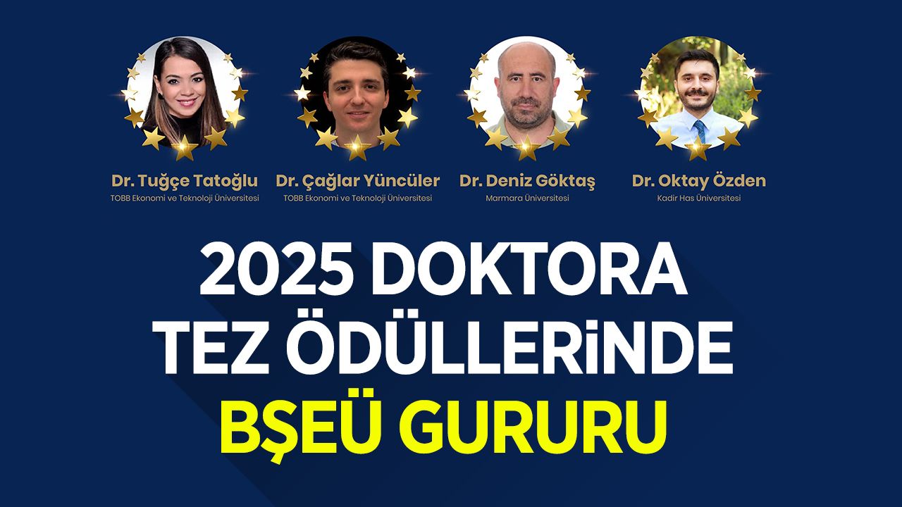 2025 Yılı Doktora Tez Ödülleri’nde birincilik ödülü Dr. Tuğçe Tatoğlu’na, ikincilik ödülü Dr. Çağlar Yüncüler’e verilirken, üçüncülük ödülü Dr. Deniz Göktaş ile Dr. Oktay Özden arasında paylaştırıldı.