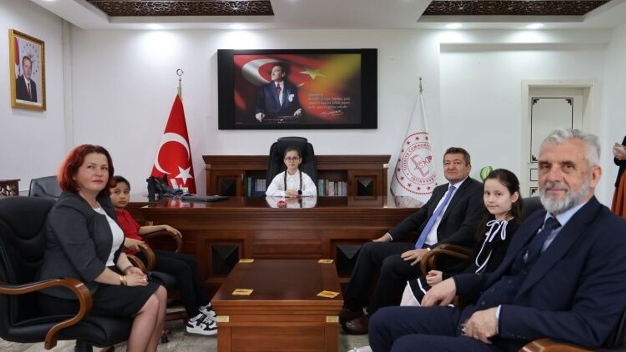 Serdal Şimşek, makamını temsilen Taha Altın, Elif Çevik ve Erva Kızılkaya isimli TOKİ İlkokulu 4. sınıf öğrencilerine devretti.