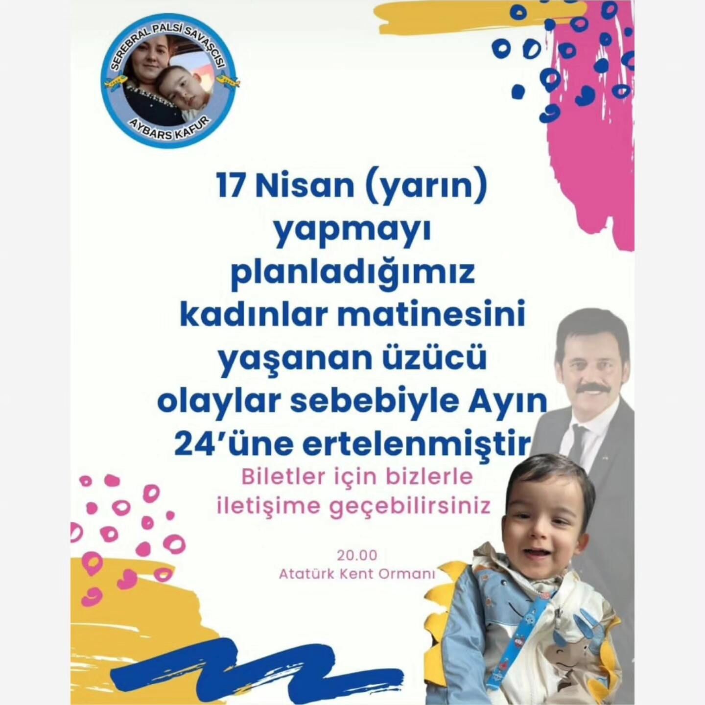 İyiliğe Dokun Yardımlaşma ve Dayanışma Derneği, 4 buçuk yaşındaki serebral palsi hastası Aybars Kafur’a destek amacıyla düzenlenmesi planlanan “Umut Gecesi” etkinliğinin 24 Nisan'a ertelendiğini açıkladı.