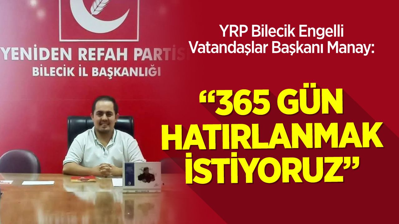 Yeniden Refah Partisi Bilecik Engelli Vatandaşlar Başkanı Hakan Manay, 3 Aralık Dünya Engelliler Günü dolayısıyla yaptığı açıklamada, engelli bireylerin yalnızca yılda bir gün hatırlanmasının yeterli olmadığını vurgulayarak toplumun her alanda kalıcı farkındalık göstermesi gerektiğini söyledi.