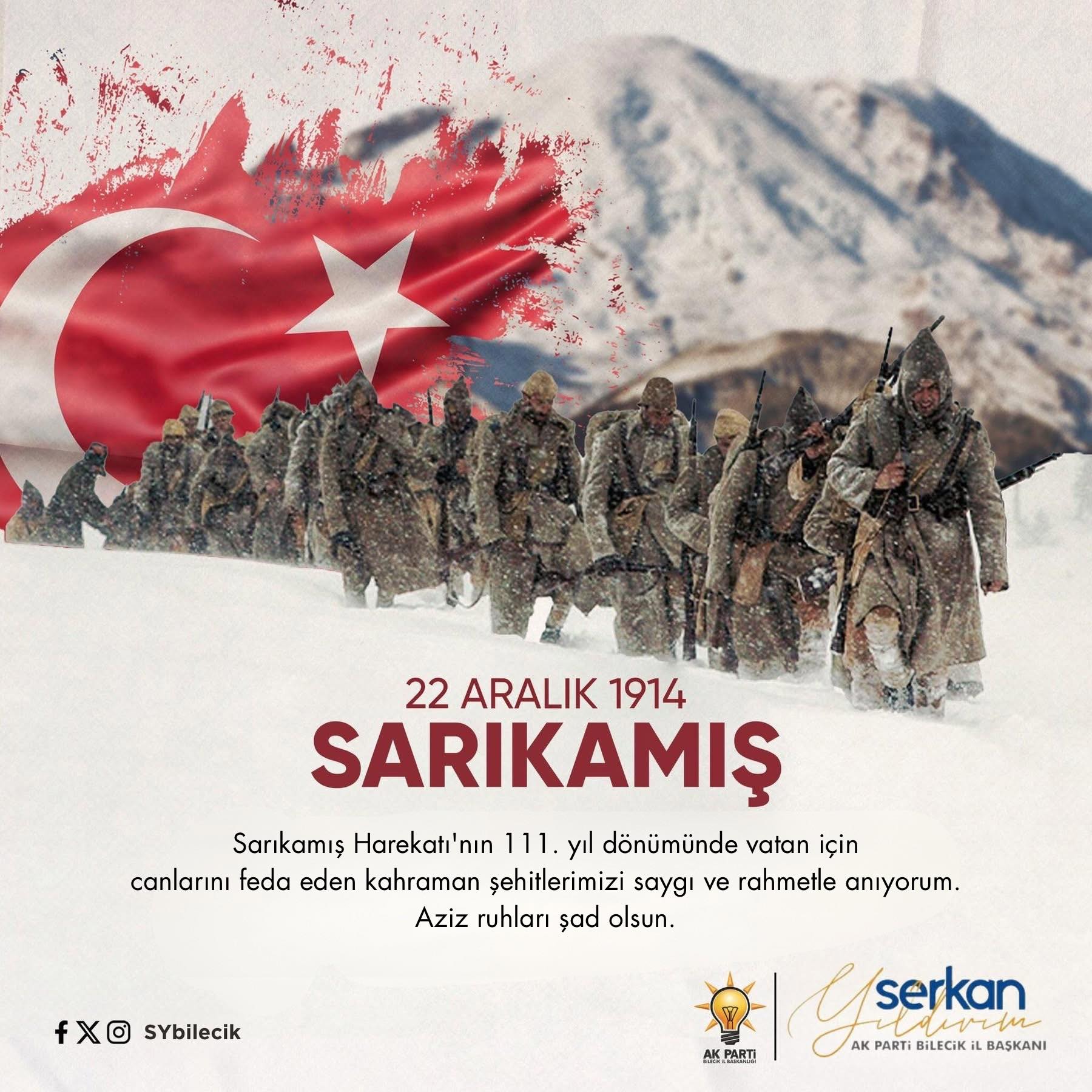 AK Parti Bilecik İl Başkanı Serkan Yıldırım, Sarıkamış Harekatı’nın 111. yıl dönümü dolayısıyla sosyal medya hesabından anlamlı bir paylaşımda bulundu. Yıldırım, paylaşımında tarihin en soğuk günü olarak anılan Sarıkamış’ta vatan uğruna canlarını feda eden kahraman şehitleri saygı ve rahmetle andığını belirtti.