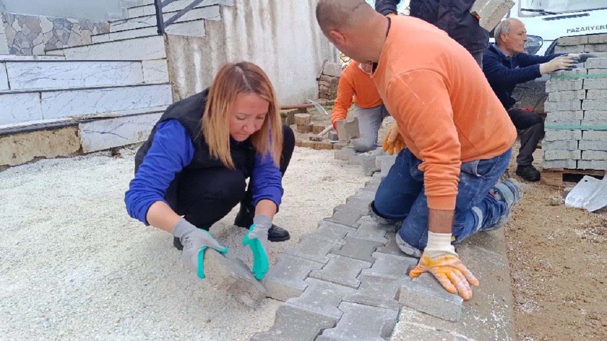 Pazaryeri Belediye Başkanı Zekiye Tekin, kendi elleriyle parke taşlarını döşeyerek sahada örnek oldu.