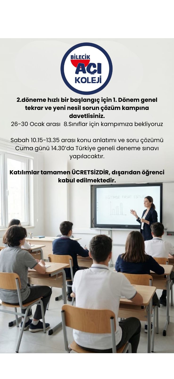 Bilecik Açı Koleji yetkilileri, kampın tamamen ücretsiz olduğunu ve dışarıdan öğrenci kabul edildiğini özellikle vurgulayarak, tüm 8. sınıf öğrencilerini bu akademik fırsattan yararlanmaya davet etti.