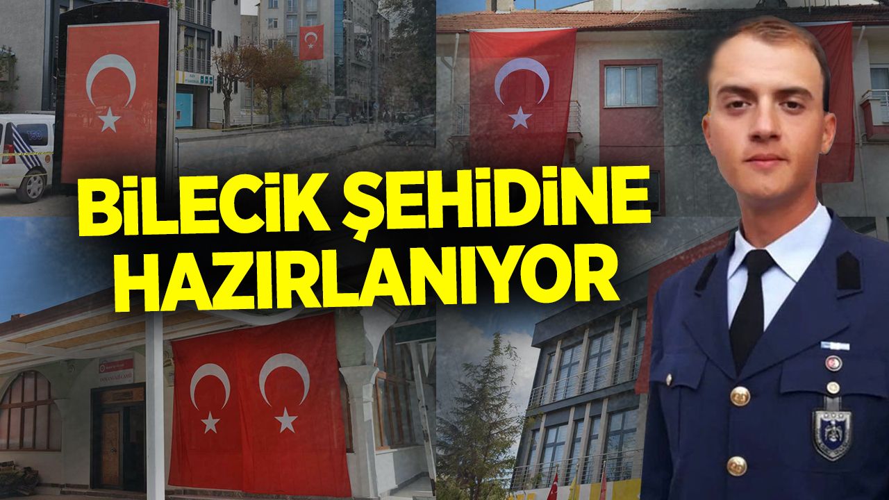 Şehidin cenazesinin yarın (13 Kasım 2025 Cuma) Bilecik’e getirilmesi beklenirken, Cumhuriyet Meydanı ve caddesine, çevredeki evlere dev Türk bayrakları asıldı.