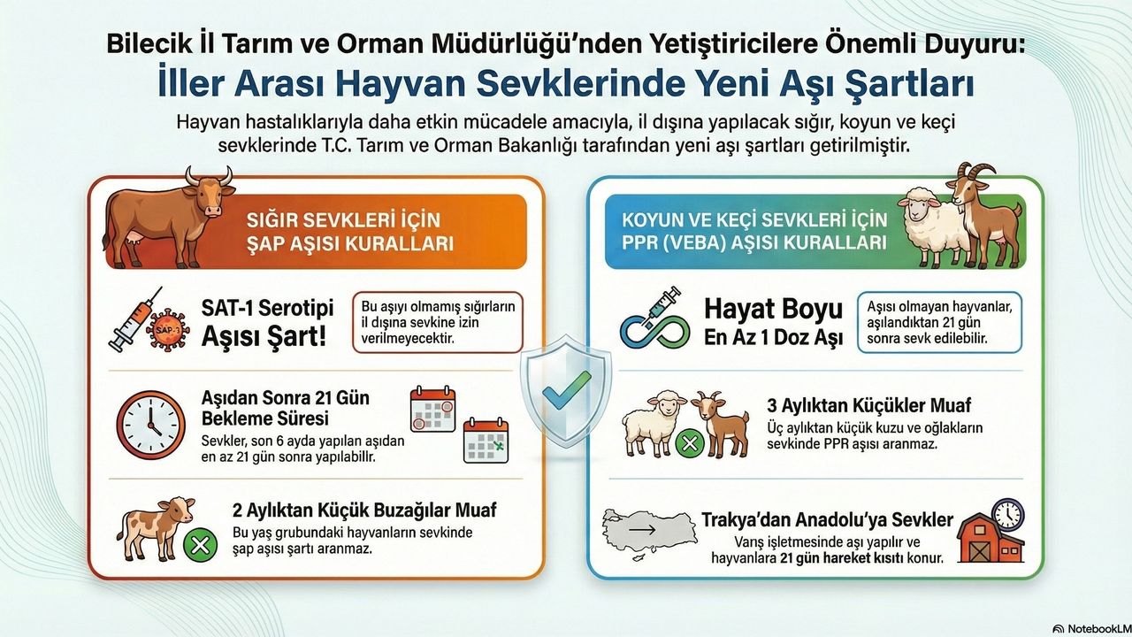 Bilecik Tarım ve Orman Müdürlüğü, iller arası hayvan sevklerinde uygulanacak aşılama kurallarının güncellendiğini duyurdu. Şap ve PPR (Veba) hastalıklarıyla mücadele kapsamında belirlenen yeni kurallar şöyle: