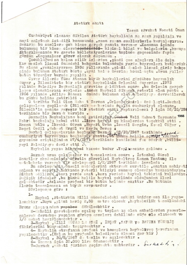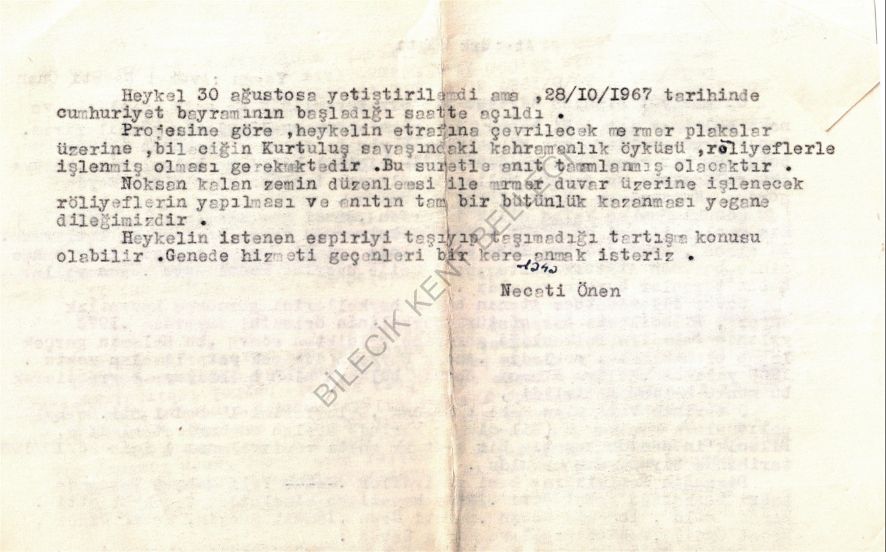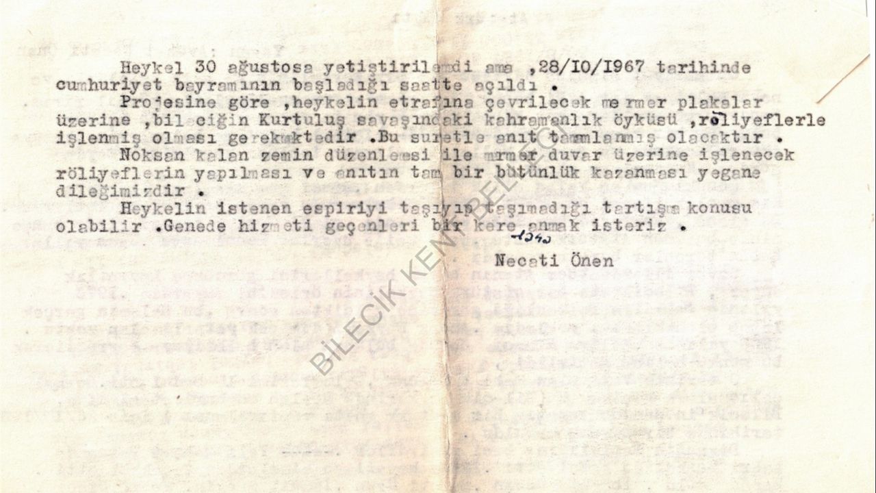Heykelin yapım sürecine ilişkin bilgiler, dönemin Bilecik Belediye Başkanı Necati Önen tarafından aktarılıyor. Başkan Önen’in anlatımına göre, Atatürk Heykeli’nin yapılması fikri, kentin Cumhuriyet değerlerini daha görünür kılma isteğinden doğdu. Bu düşünce, dönemin Valisi Mehmet Tarcan’ın da destekleriyle somut bir adım hâline geldi.