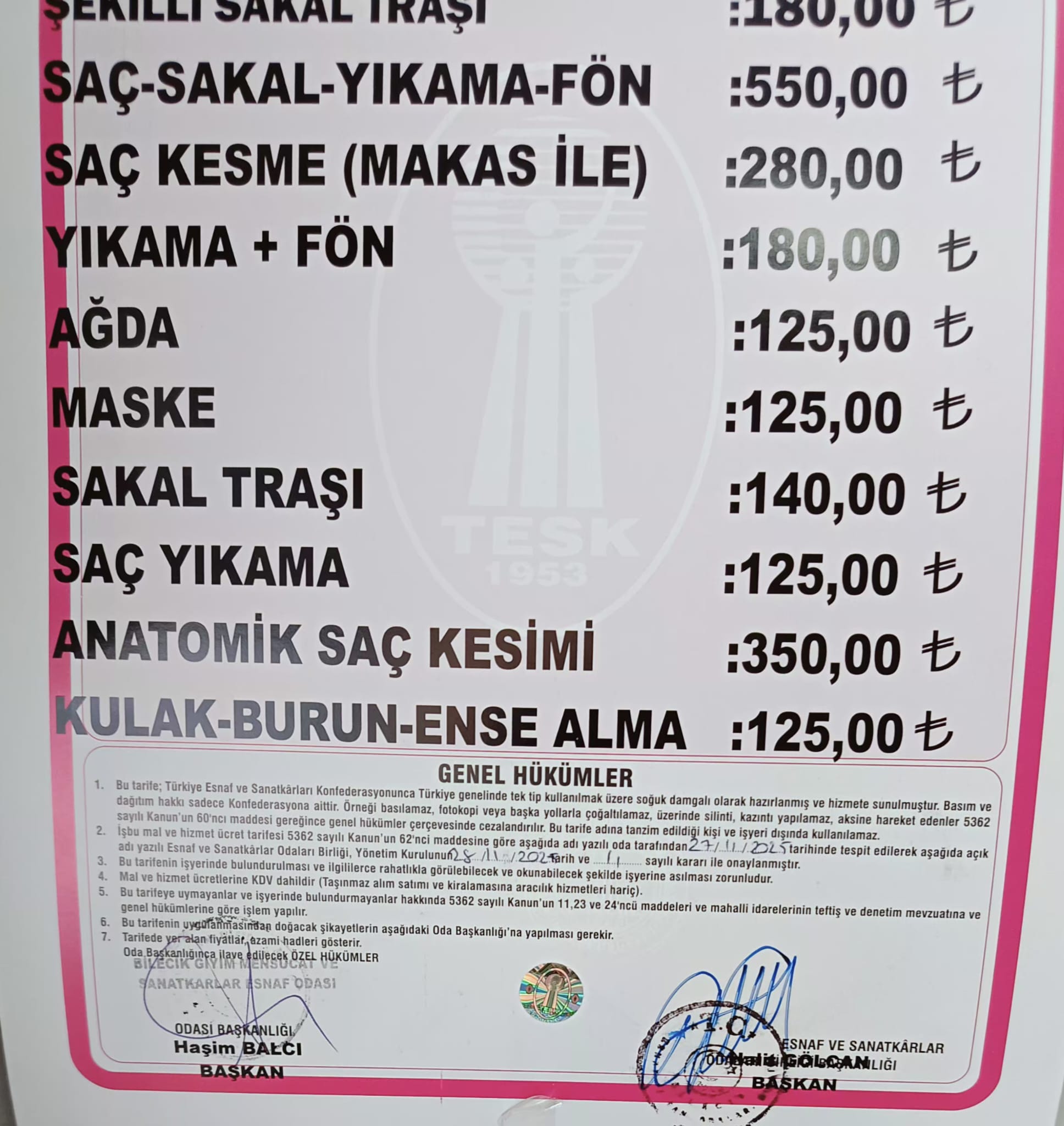 Bilecik’te erkek kuaförleri 2026 yılı itibarıyla hizmet ücretlerine zam yapıldı.