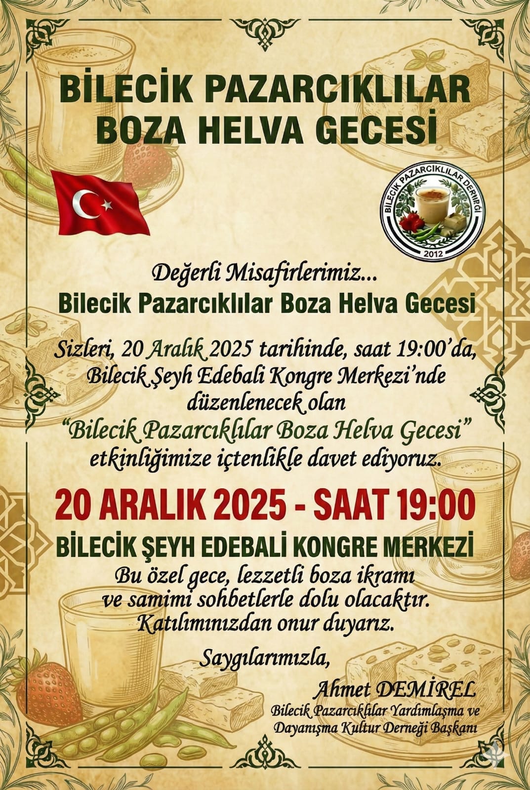 Bilecik’te faaliyetlerini sürdüren Bilecik Pazarcıklılar Derneği, birlik ve beraberliği pekiştirmek amacıyla anlamlı bir etkinliğe imza atıyor. Dernek, bugün saat 19.00’da Şeyh Edebali Kongre Merkezi’nde düzenlenecek olan Boza ve Helva Gecesi ile vatandaşları bir araya getirecek.
