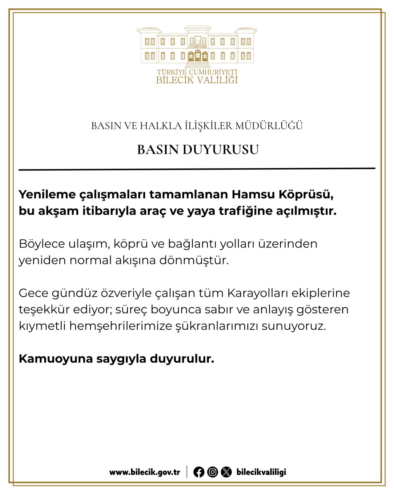 “Yenileme çalışmaları tamamlanan Hamsu Köprüsü, bu akşam itibarıyla araç ve yaya trafiğine açılmıştır. Böylece ulaşım, köprü ve bağlantı yolları üzerinden yeniden normal akışına dönmüştür. Gece gündüz özveriyle çalışan tüm Karayolları ekiplerine teşekkür ediyor; süreç boyunca sabır ve anlayış gösteren kıymetli hemşehrilerimize şükranlarımızı sunuyoruz. Kamuoyuna saygıyla duyurulur.”