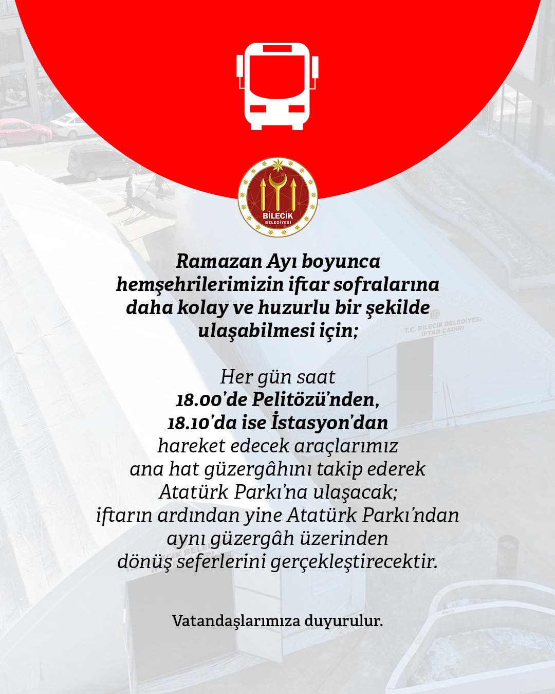 Bilecik Belediyesi, Ramazan ayı boyunca vatandaşların iftar sofralarına daha kolay ve huzurlu ulaşabilmesi amacıyla ring seferleri düzenleyecek.