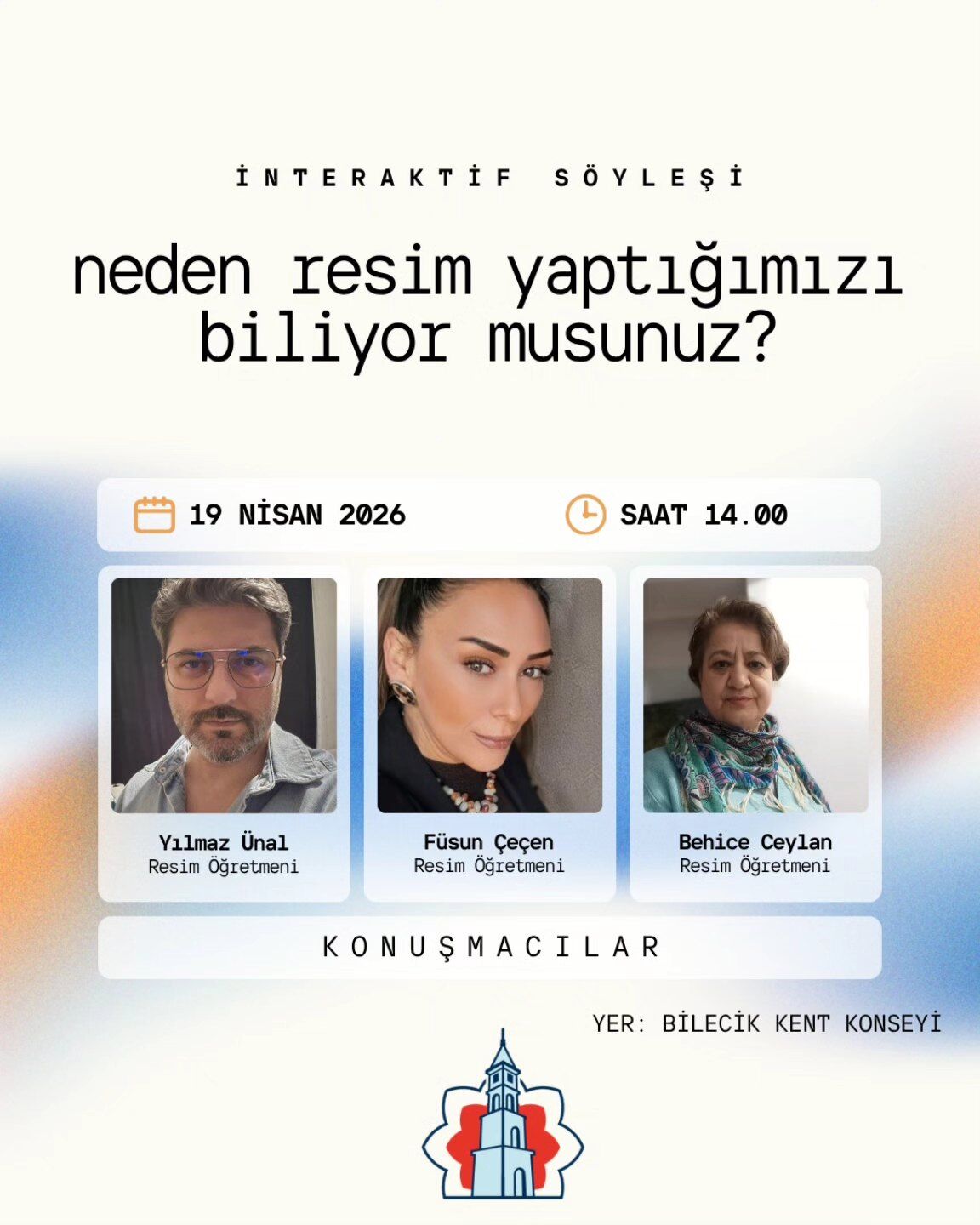 Kent Konseyinden yapılan açıklamaya göre, 19 Nisan 2026 Cumartesi günü saat 14.00’te düzenlenecek etkinlikte, resim sanatının insan hayatındaki yeri ve ifade biçimi farklı yönleriyle ele alınacak. Söyleşide resim öğretmenleri Yılmaz Ünal, Füsun Çeçen ve Behice Ceylan konuşmacı olarak yer alacak. Katılımcılar, sanatın derin anlamı üzerine yapılacak interaktif sunumla birlikte resim yapmanın arka planını keşfetme imkânı bulacak.