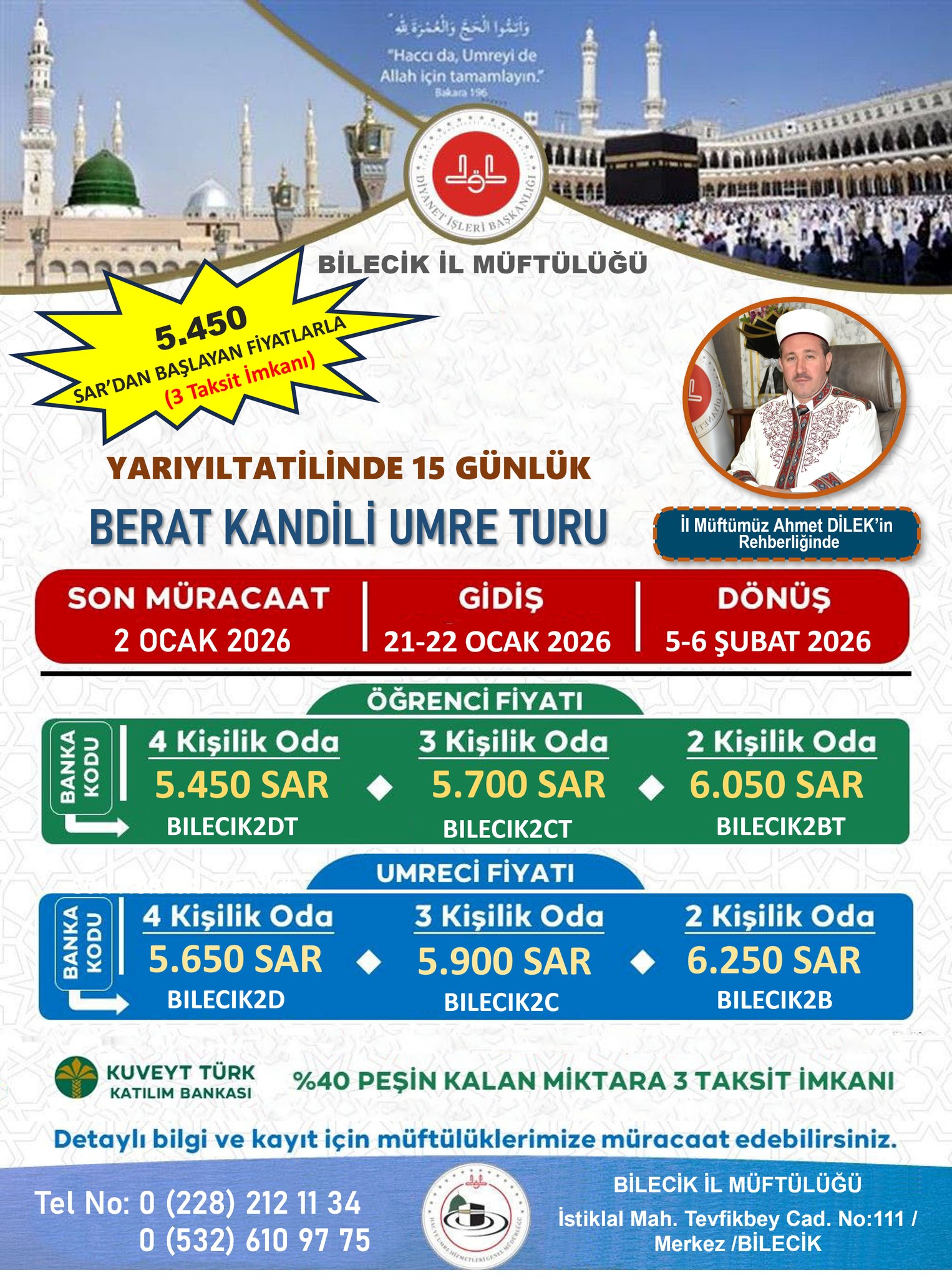 Umre programının 21–22 Ocak 2026 çıkışlı ve 5–6 Şubat 2026 dönüşlü olarak gerçekleştirileceğini belirten Müftü Dilek, programın Diyanet İşleri Başkanlığı güvencesiyle ve 5.450 riyalden başlayan indirimli fiyatlarla yapılacağını ifade etti. Bu manevi yolculuğa katılmak isteyen vatandaşlar, son başvuru tarihi 2 Ocak 2026 olmak üzere il ve ilçe müftülüklerine veya din görevlilerine müracaat ederek detaylı bilgi alabilecek.