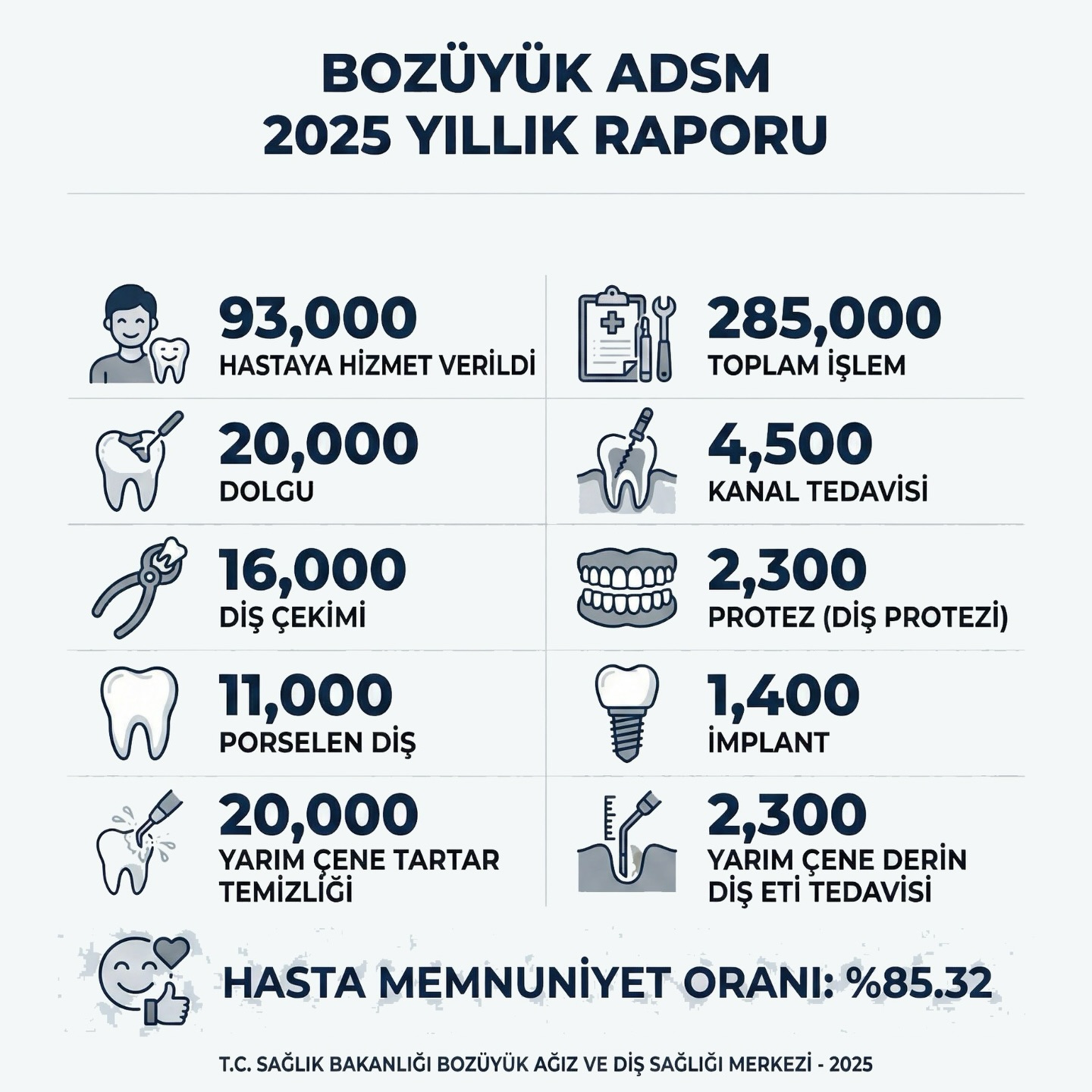 Bozüyük Ağız ve Diş Sağlığı Merkezi (ADSM), 2025 yılı faaliyet raporunu açıkladı. Merkez, yıl boyunca 93.000 hastaya hizmet sunarken toplam 285.000 işlem gerçekleştirdi.