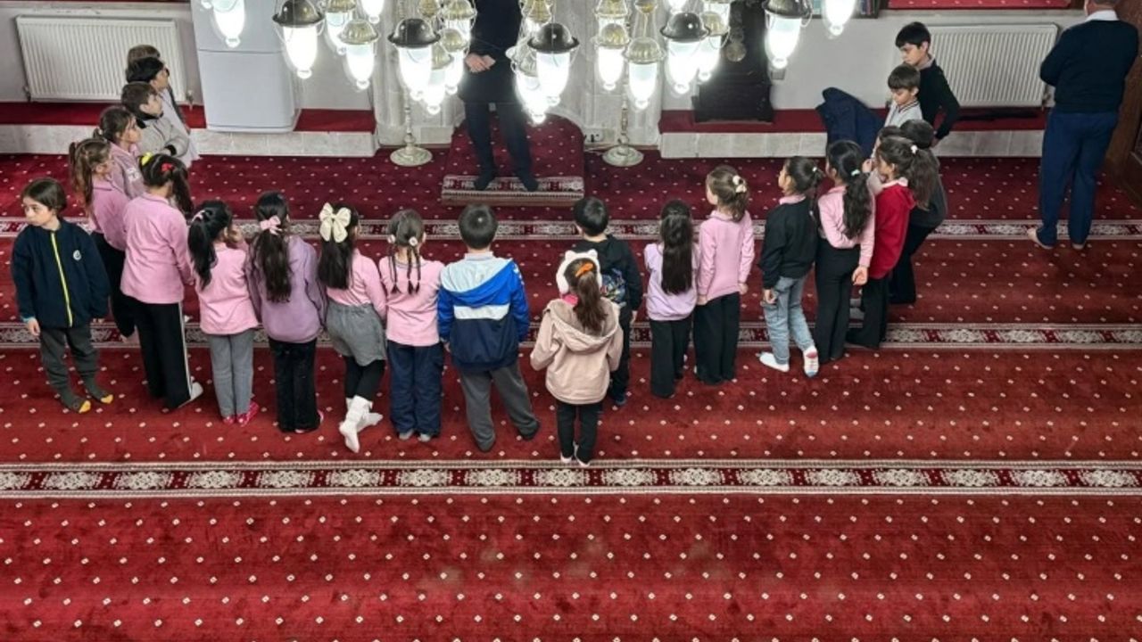 Öğrenciler, öğretmenleri Nimet Polat ve Kur’an Kursu öğreticisi Aylin Kahveci eşliğinde camiyi gezdi.
