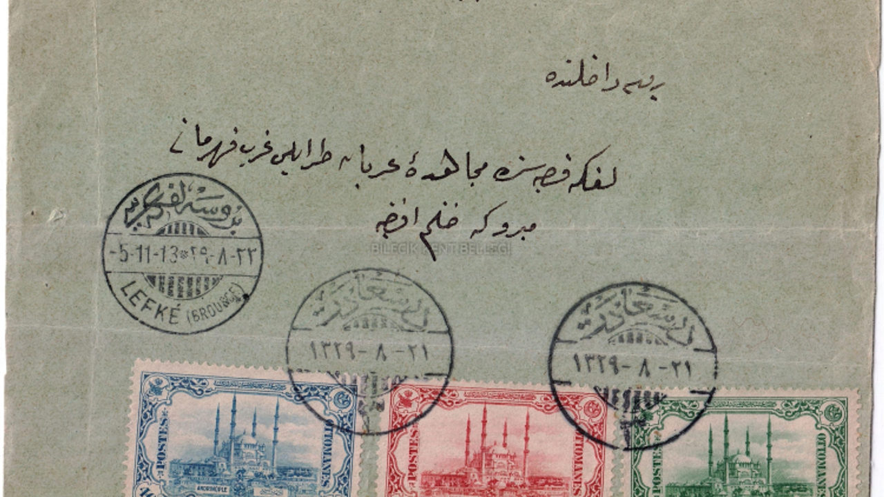 Bilecik Kent Belleği arşivinde yer alan tarihi görüntülerde, 1913 tarihli, Osmanlıca yazılmış bir zarf, geçmişin sayfalarını aralıyor ve bize bir zamanlar uzak şehirler arasındaki mektuplaşma kültürünü fısıldıyor. Zarf, İstanbul’dan gönderilmiş ve pulun üzerinde Dersaadet çıkış damgası, zarfın üzerinde ise “Bursa Lefkesi” arrive damgası bulunuyor. Edirne Hatıra Serisi’ne ait tam seri damgalı bu belge, çift lisana sahip gönderici ve arrive damgalarıyla Osmanlı posta tarihinin nadide örneklerinden biri olarak dikkat çekiyor.
