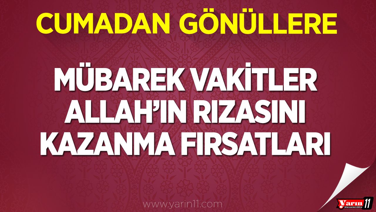 Buraya kadar anlattığımız mübarek zaman dilimleri, yılda bir defa yaşayabildiğimiz aylar ve günlerdir. Bunlardan başka bir de her hafta istifade imkânı bulduğumuz mübarek vakitler vardır ki, bunların başında haftalık toplanma vakti olan cuma günü gelmektedir. Kur’ân-ı Kerîm’deki sûrelerden birinin isminin ‘Cuma’ olması ve yine aynı sûrede Cuma namazından açıkça bahsedilmesi bu vaktin önemini göstermektedir. Peygamber Efendimiz, cumanın “Müslümanların bayramı” ve “üzerine güneş doğan en hayırlı gün” olduğunu, Hz. Âdem’in bu günde yaratıldığını, cennete girdiğini ve tekrar cennetten çıkartıldığını ifade etmektedir. Yine Peygamberimiz, “Cuma günü öyle bir an vardır ki, şayet bir Müslüman kul namaz kılarken o âna rastlar da Allah’tan bir şey dilerse, Allah mutlaka ona dilediğini verir.” buyurarak cumanın icabet ânına dikkat çekmektedir. Bir hadiste bu kıymetli vaktin, imamın hutbe için minbere çıkması ile namazın eda edilmesi arasındaki vakit olabileceği62 ifade edilmekteyse de icabet ânının kesin bir şekilde belirlenmemesi, cuma gününün tümüne değer verilmesi gerektiğini göstermektedir. Şu hâlde cuma günü her ânını Allah’ın rızasına uygun bir şekilde geçiren kimsenin bu vakti yakalaması ve Allah’ın da onun dileklerini yerine getirmesi umulur.