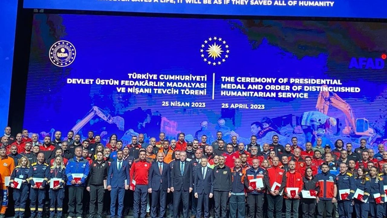 Ankara’da bulunan Beştepe Millet Kongre ve Kültür Merkezi'nde devlet üstün fedakârlık madalyası tevcih töreni yapıldı. Törende, deprem bölgelerinde arama kurtarma faaliyeti yapan 218'i Türk, 116'sı yabancı 334 kişi devlet üstün fedakârlık madalyası ve nişanı tevcihine layık görüldü. Eskişehir'den de fedakârlık madalyası almaya layık görülen Dorlion Arama Kurtarma Derneği ve Odunpazarı Belediyesi Arama Kurtarma Ekibi tören için salonda yerlerini aldı. Dorlion Arama Kurtarma Derneği'ni temsilen törene katılan Dernek Başkanı Abdullah Aydıngör ve Odunpazarı Belediyesi Arama Kurtarma ekibi adına ekip lideri Ercan Temel, üstün fedakârlık madalyasını Cumhurbaşkanı Yardımcısı Fuat Oktay'ın elinden aldı. Cumhurbaşkanı Recep Tayyip Erdoğan törene katılan protokol üyeleri ve arama kurtarma ekipleri ile hatıra fotoğrafı çektirdi. İHA