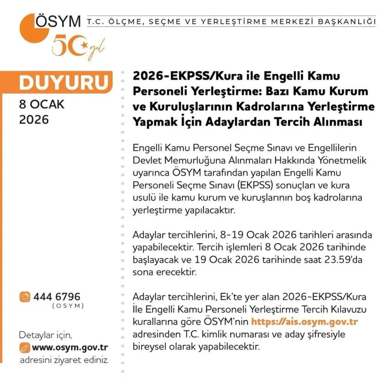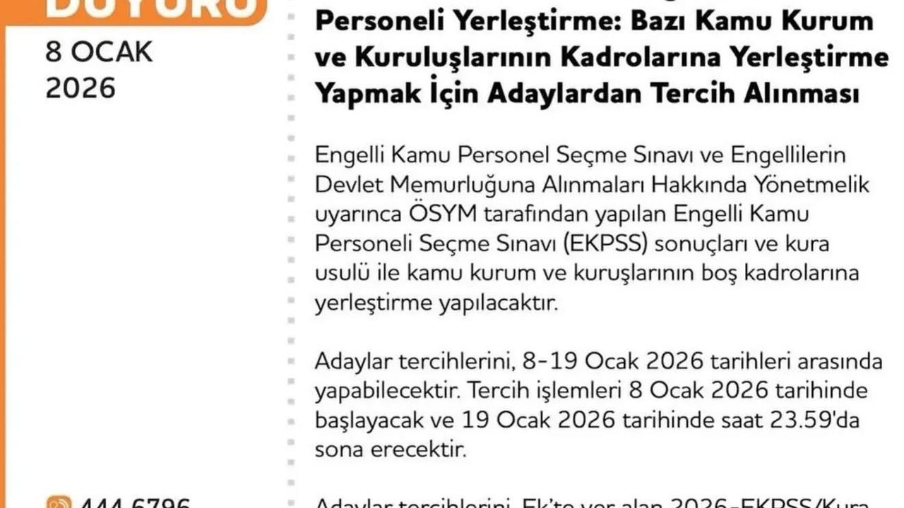 Tercihler, 2026-EKPSS/Kura ile Engelli Kamu Personeli Yerleştirme Tercih Kılavuzu kurallarına göre, ÖSYM’nin https://ais.osym.gov.tr adresinden T.C. kimlik numarası ve aday şifresi ile bireysel olarak yapılabilecek.