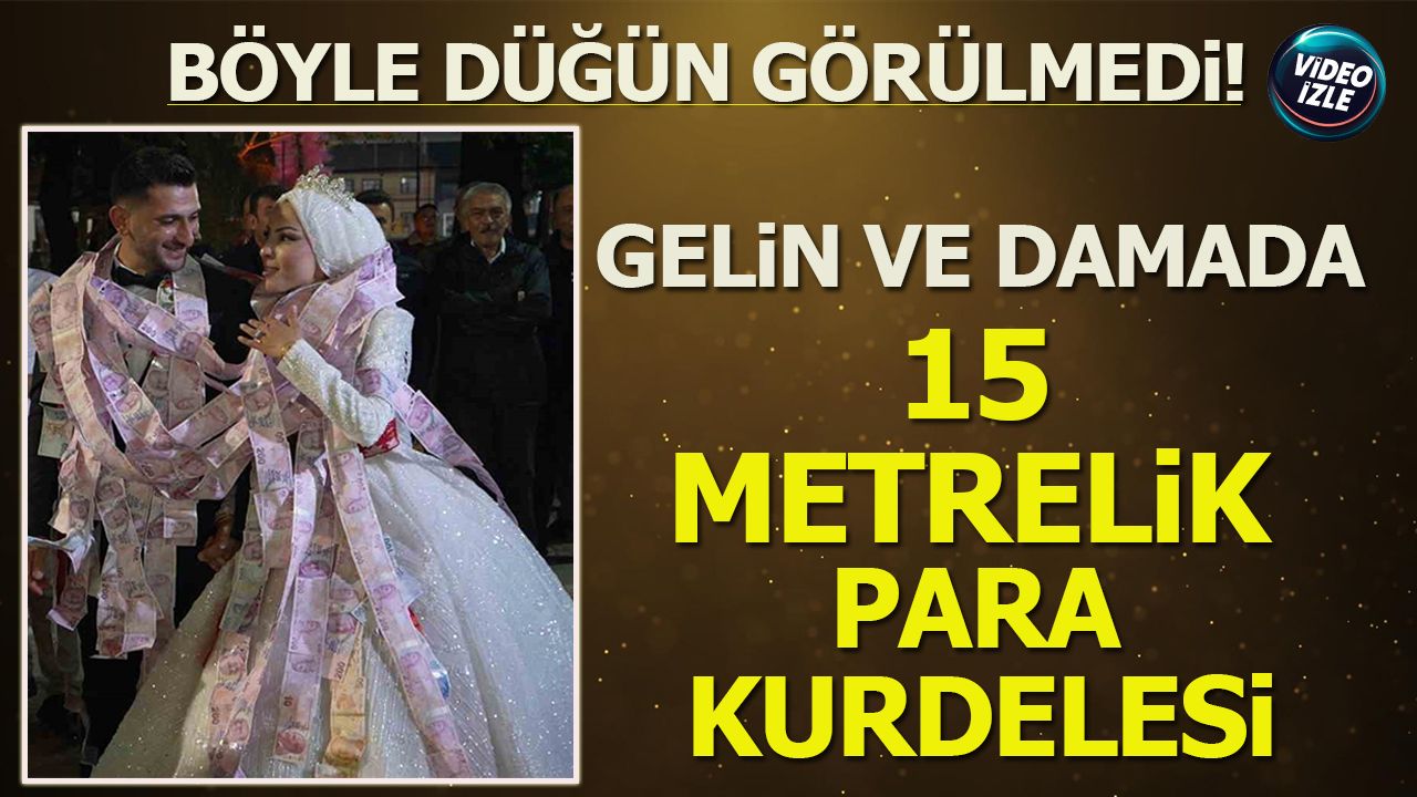Bilecik’te bir düğünde gelin ile damada boyu 15 metreye ulaşan para kurdelesi takıldı.