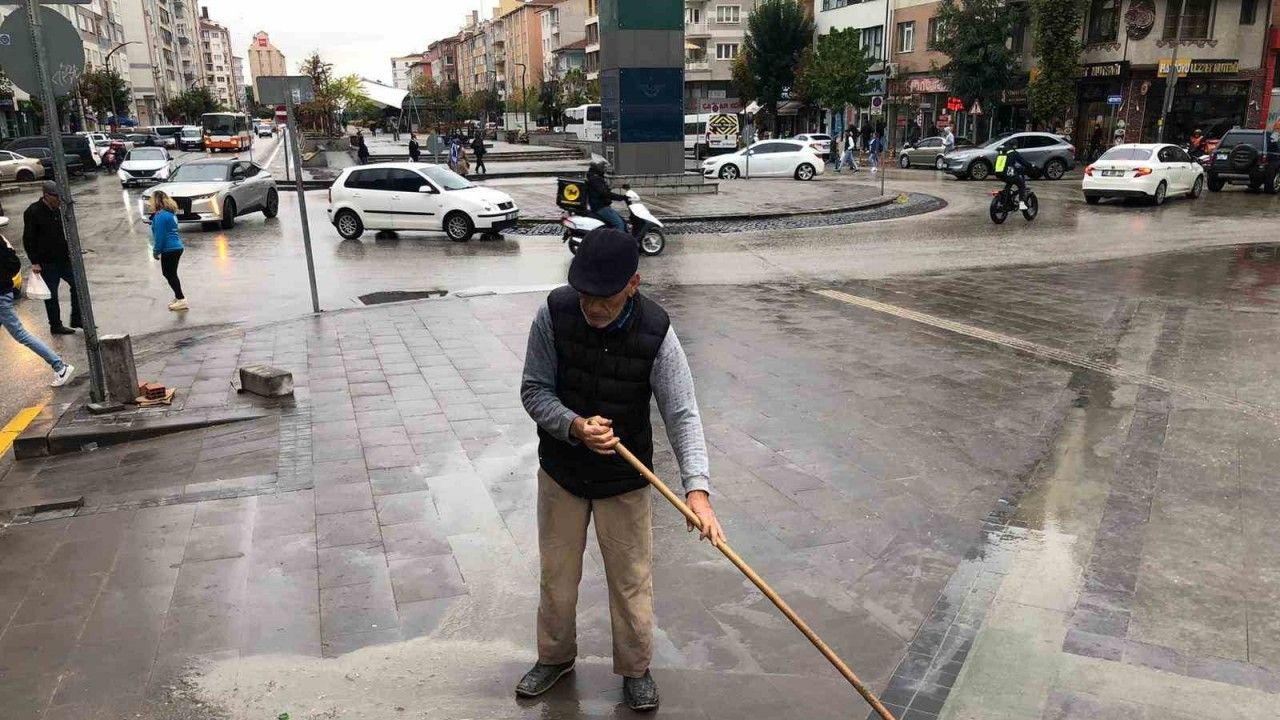 Eskişehir’de bir vatandaş, caddede yağmur sonrasında oluşan çamuru temizleyerek örnek bir davranışta bulundu.