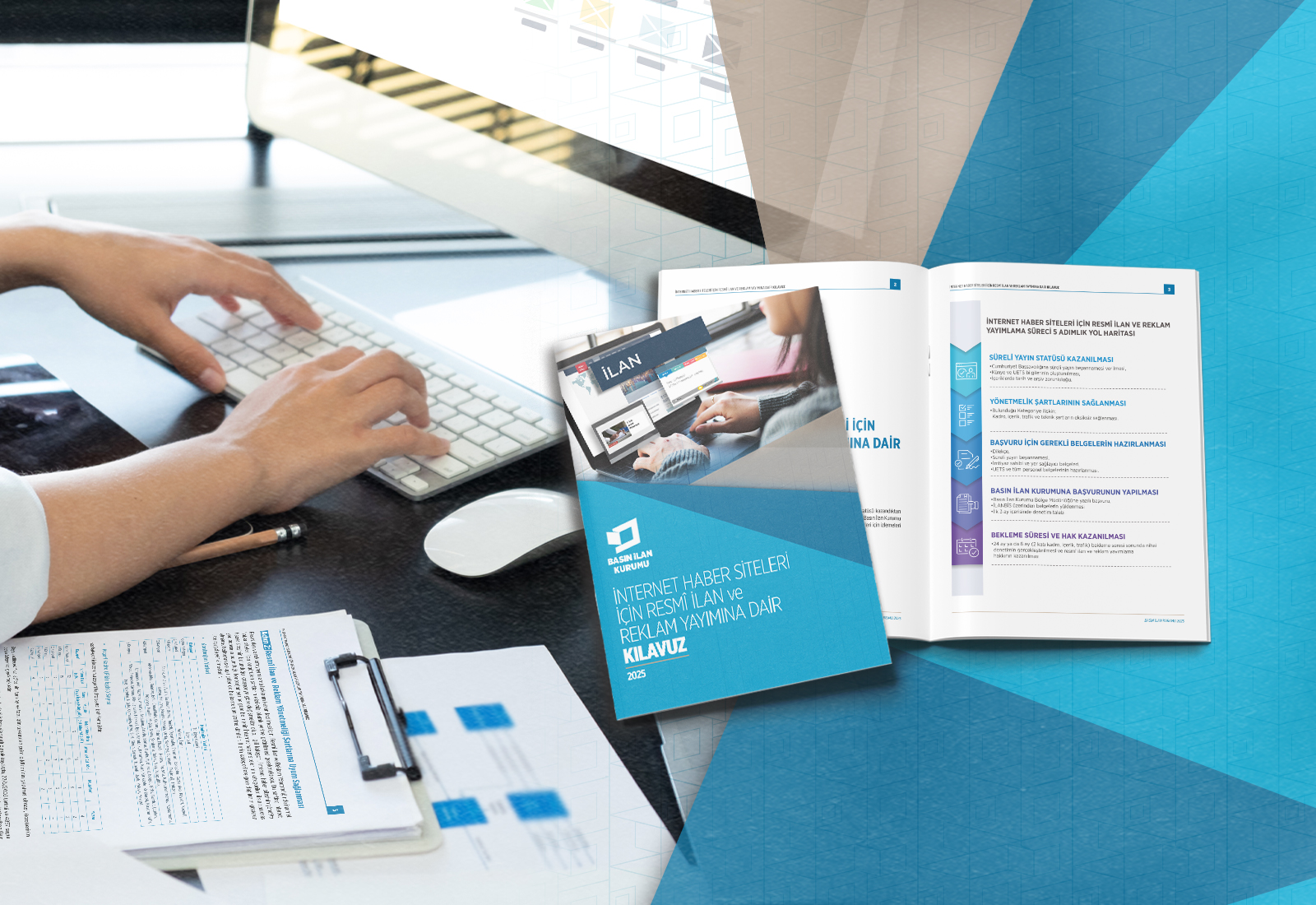 Basın Kanununa göre süreli yayın statüsü kazanan internet haber sitelerinin; Basın İlan Kurumu Teşkiline Dair 195 sayılı Kanun, Resmî İlan ve Reklam Yönetmeliği ile Basın İlan Kurumu Yönetim Kurulu Tebliğleri kapsamında yerine getirmesi gereken yükümlülükler Kılavuz’da açıklandı. Süreç, süreli yayın statüsünün elde edilmesinden başlayarak başvuru, denetim ve hak kazanımına kadar olan 5 adımlık bir yol haritası ile özetlendi.