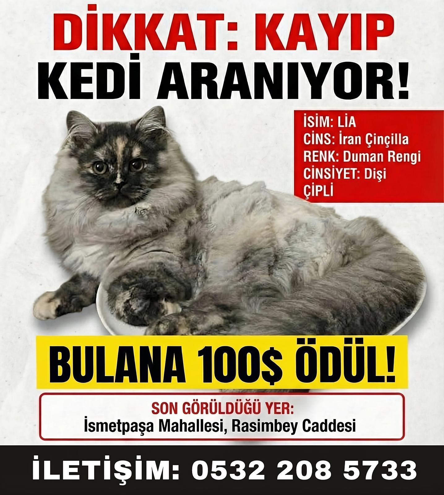 Bilecik’in İsmetpaşa Mahallesi’nde kaybolan “Lia” isimli kedi için sahibi tarafından arama çalışmaları başlatıldı. Duman rengine sahip İran Çinçilla cinsi dişi kedi, en son Rasimbey Caddesi civarında görüldü.
