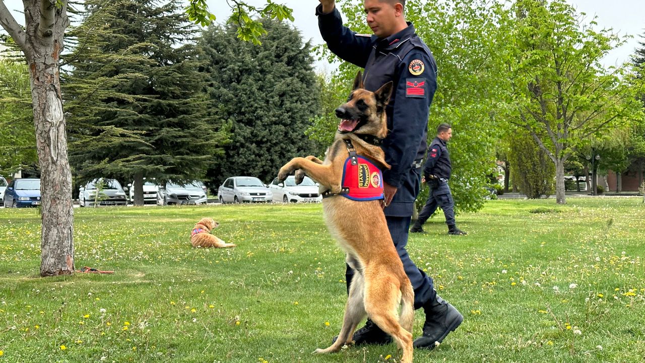 Eskişehir’de jandarma asayiş köpeği ‘Atak’ ve ‘Akan’, İKAF’23 etkinliklerinde hünerlerini sergileyip öğrencilerin dikkatini çekerken, adeta fuarın gözdeleri oldu.