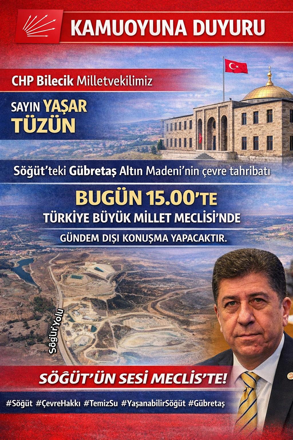 Edinilen bilgilere göre Milletvekili Tüzün, konuşmasında Söğüt halkının uzun süredir dile getirdiği çevre kaygılarını Meclis kürsüsünden aktaracak, altın madeni faaliyetlerinin doğa, tarım alanları ve temiz su kaynakları üzerindeki etkilerinin araştırılması gerektiğine dikkat çekecek.