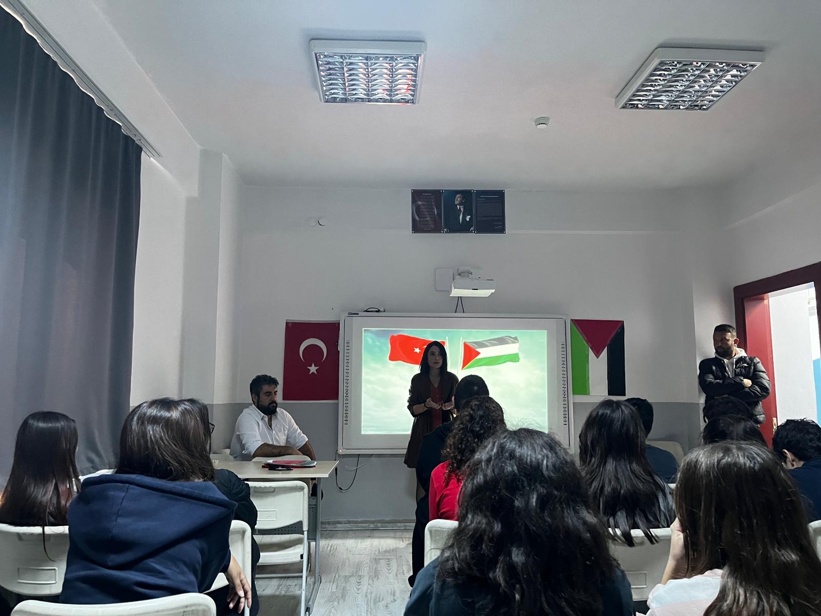 Filistin farkındalık etkinlikleri kapsamında ortaokul öğrencileri barış ve demokrasi temalı farkındalık eğitimi düzenledi. Lise öğrencileri ise destek mesajlarını içeren pankartlar hazırlayarak Filistin halkına duyarlılıklarını ifade etti.