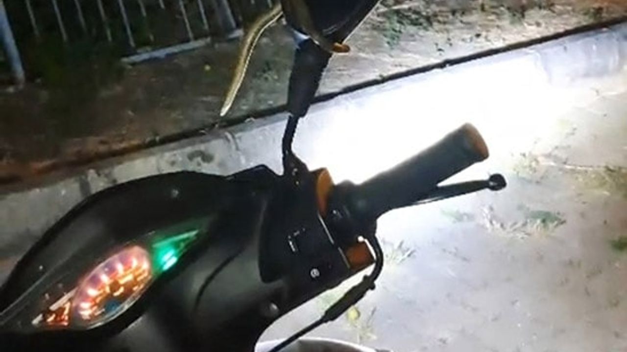Olay, ilçeye bağlı Karşıyaka Mahallesi'ndeki Osman Gazi Camii yakınlarında yaşandı. Park halindeki motosikletin direksiyon kısmına giren yılanı fark eden sürücü Erdem Sarıca, aracı kullanmaktan vazgeçti. O anlarda herhangi bir tehlike yaşanmazken, çevrede toplanan vatandaşlar da şaşkınlıkla durumu izledi. Kısa bir süre sonra yılan ortadan kayboldu.