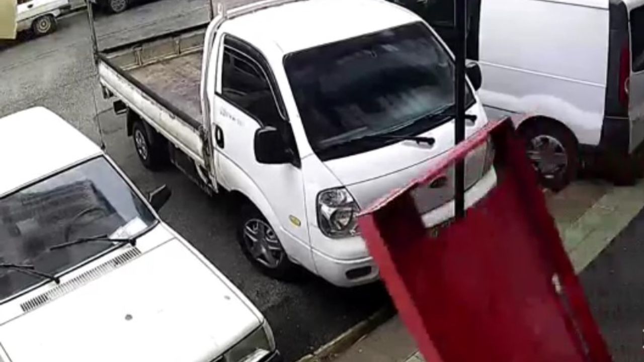 Buzdolabı kapağının devrilerek otomobile zarar verdiği anlar güvenlik kamerasına yansıdı.İHA
