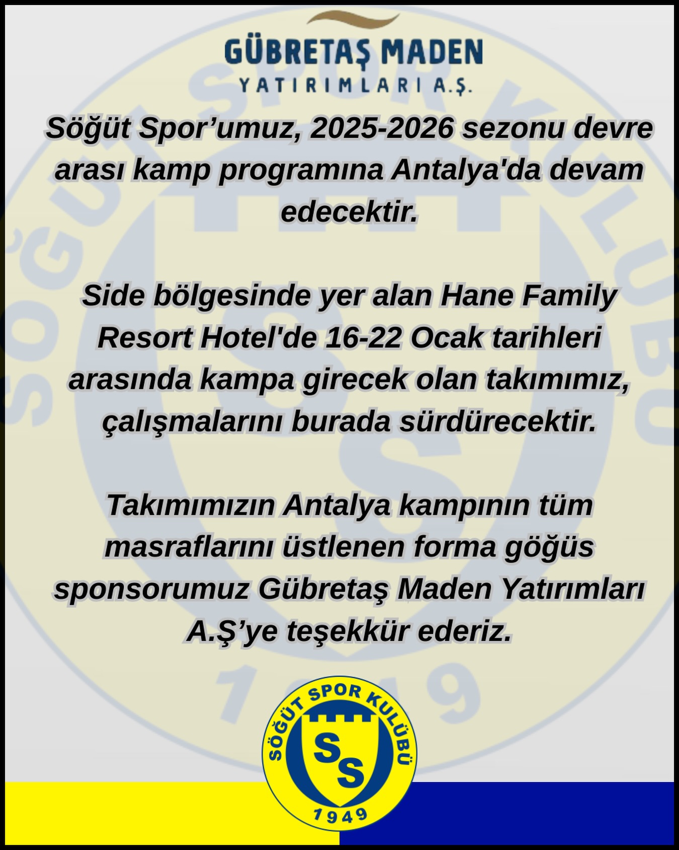 Takımın Antalya kampının tüm masraflarını üstlenen forma göğüs sponsoru Gübretaş Maden Yatırımları A.Ş.’ye Söğütspor yönetimi teşekkür etti.