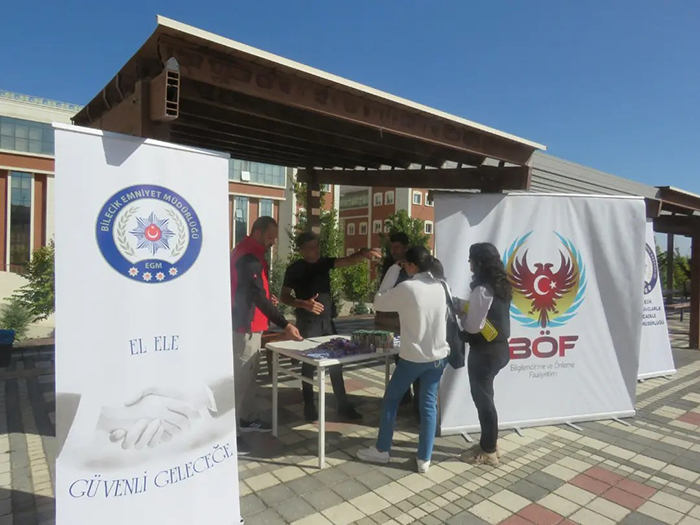 Bilecik İl Emniyet Müdürlüğünce yürütülen “El Ele Güvenli Geleceğe”, “En İyi Narkotik Polisi Anne”, “Siberay” ve “KADES (Kadın Destek Uygulaması)”isimli projeler kapsamında, 2023-2024 Eğitim ve Öğretim döneminde Bilecik Şeyh Edebali Üniversitesine bağlı fakülte ve Meslek Yüksek Okullarında öğrenim gören öğrencilerin bilgilendirilmesi kendilerini güvende hissetmeleri ve bilgilendirme ve önleme Faaliyetlerinin ruhuna uygun olarak sürekli iletişim kanallarının açık tutulabilmesi, suç ve suçlularla daha etkin ve güçlü bir mücadele ortamı oluşturabilmek amacıyla Bilecik Şeyh Edebali Üniversitesi Gülümbe Kampüsü içerisinde stand açıldı.