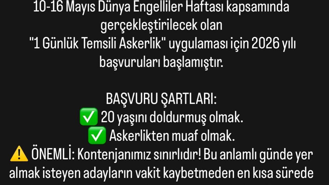 Dünya Engelliler Haftası çerçevesinde düzenlenen uygulama ile engelli bireylerin temsili askerlik deneyimi yaşamalarının hedeflendiği belirtildi. Dernekten yapılan açıklamada, başvuru için 20 yaşını doldurmuş olmak ve askerlikten muaf bulunmak gerektiği ifade edildi.