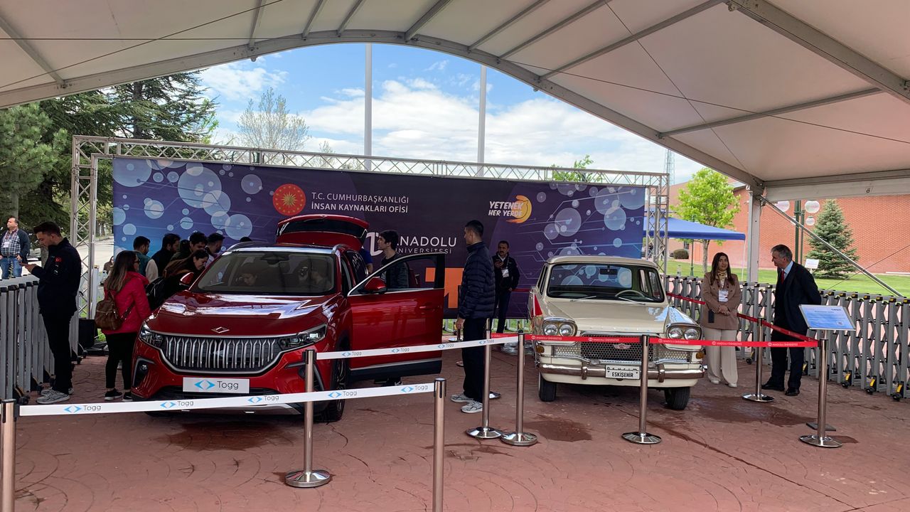 Anadolu Üniversitesi’nde gerçekleşen İç Anadolu Kariyer Fuarı'nda (İKAF'23) Yunus Emre Kampüsü’nde yan yana sergilenen TOGG ve Devrim otomobili, yerli-yabancı öğrencilerden büyük ilgi gördü.