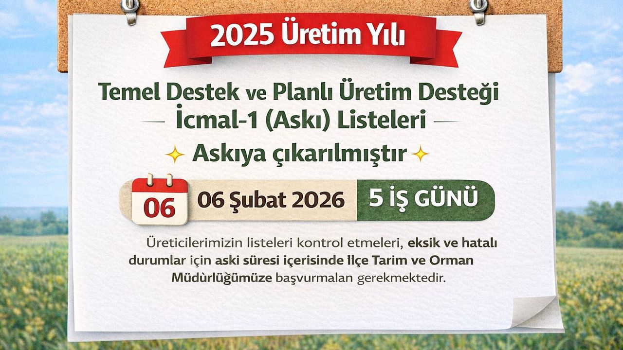 Bilecik Tarım ve Orman Müdürlüğü tarafından yapılan duyuruya göre, 2025 Üretim Yılı Temel Destek ve Planlı Üretim Desteği İcmal-1 (Askı) Listeleri, 6 Şubat 2026 tarihi itibarıyla askıya çıkarıldı.