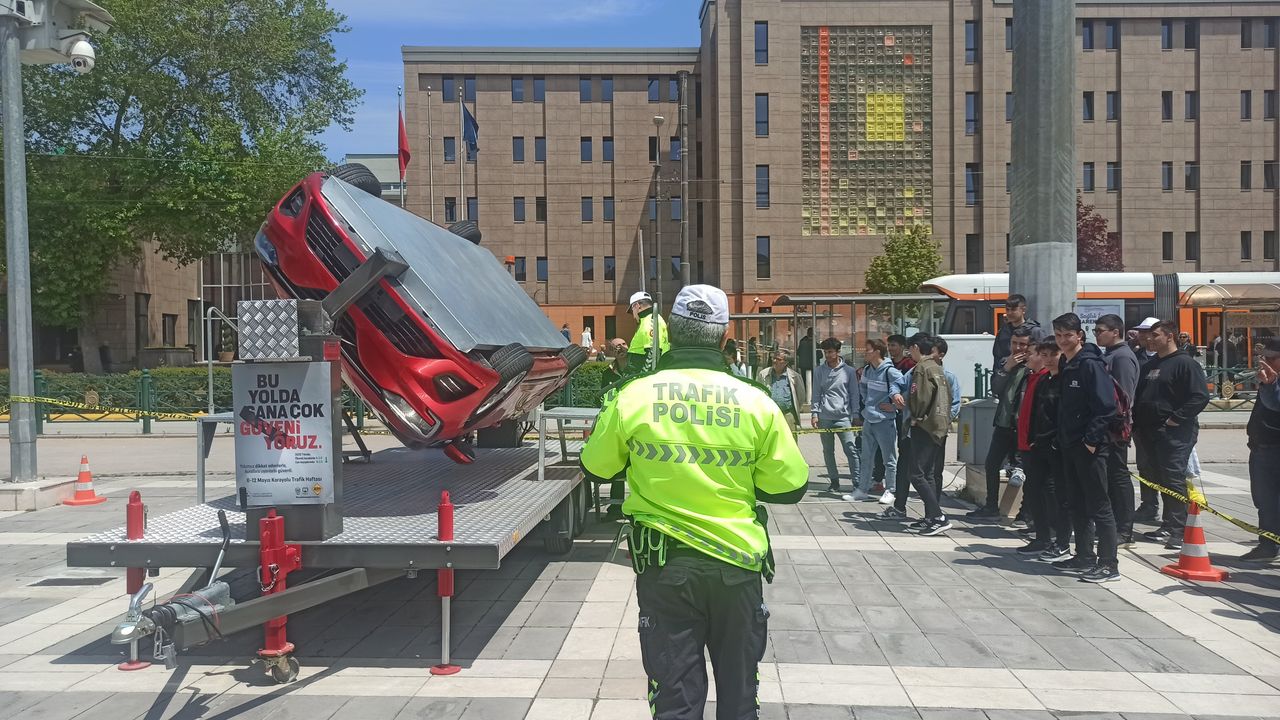 Eskişehir'de İl Emniyet Müdürlüğü tarafından takla similasyonu kurularak vatandaşlara emniyet kemerinin önemi anlatıldı.