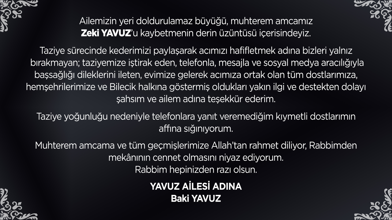 Ailemizin yeri doldurulamaz büyüğü, muhterem amcamız Zeki YAVUZ’u kaybetmenin derin üzüntüsü içerisindeyiz.