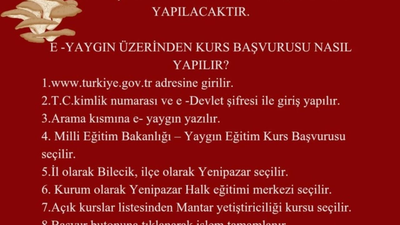 Yenipazar’da üretimi ve girişimciliği desteklemek amacıyla Halk Eğitim Merkezi Müdürlüğü tarafından düzenlenen Mantar Yetiştiriciliği Kursu, 16 Şubat 2026 tarihinde başlayacak.