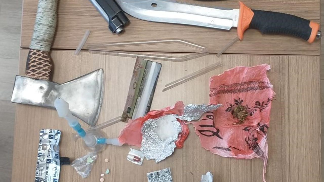 Araçta yapılan aramada, tabanca ve şarjörün de 2 fişek, balta, 14 parça içime hazır metamfetamin, 5 parça extacy, bir parça peçeteye emdirilmiş şekilde bonzai, 2 içime hazır esrar, 2 içime hazır skunk, bir lyrica, bir paket uyuşturucu madde içiminde kullanılan çarşaf, bir uyuşturucu içiminde kullanılan nargile, 6 hap bulunan 2 tablet ele geçirildi. Olayla ilgili soruşturma sürüyor.İHA